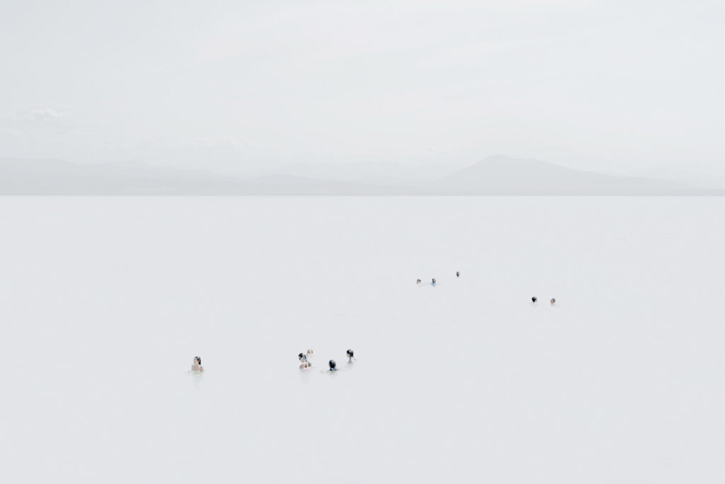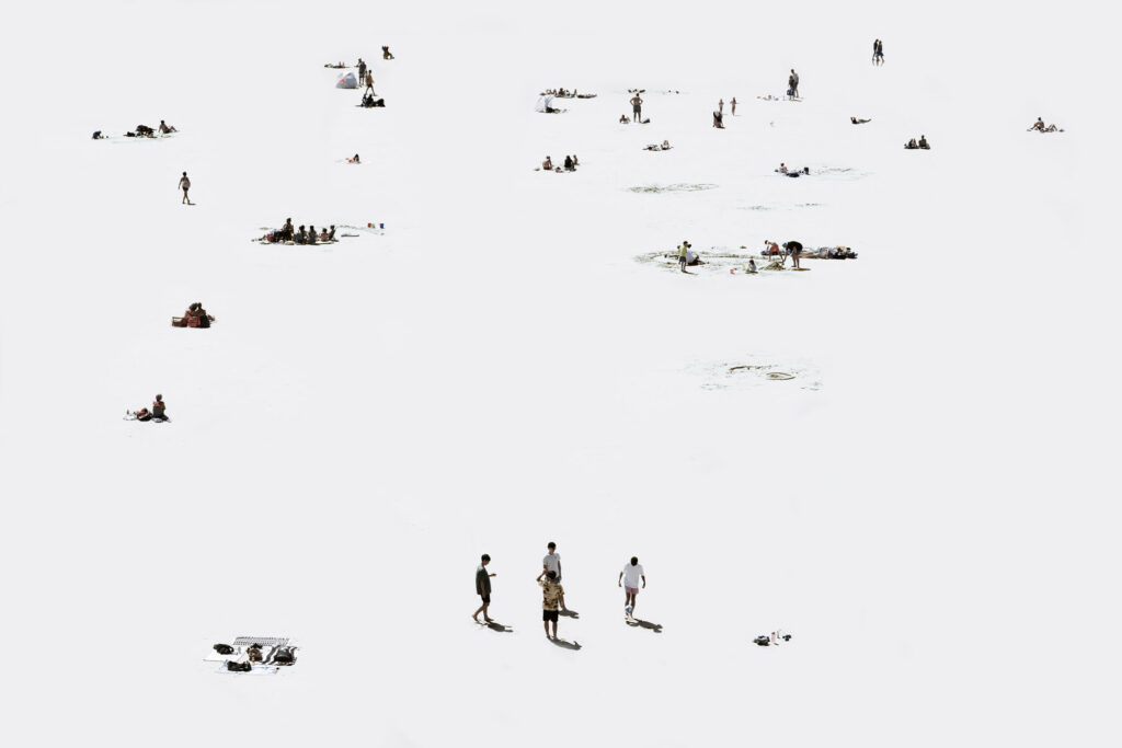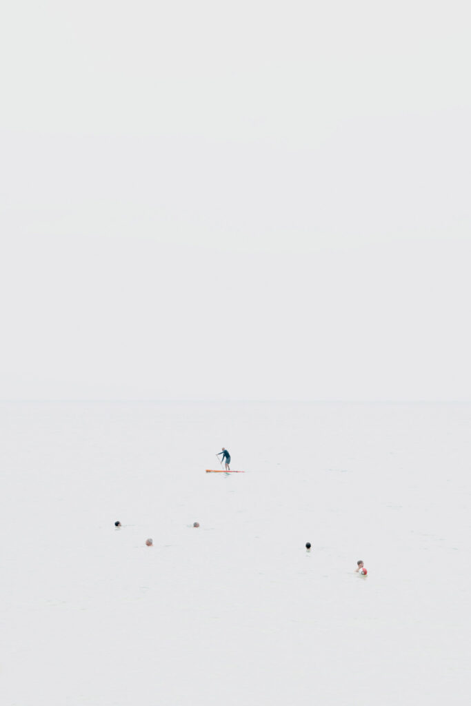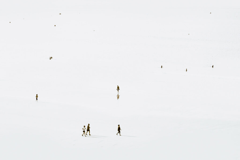 Le corps et ses silhouettes. Ces « déambulants » venant s’aligner, se croiser dans une douce composition. J’ai souvent pensé à des vols d’oiseaux dans leur nués, nous offrant une dynamique des corps. J’ai choisi une teinte évanescente, épuré ou le contraste vient télescoper ces individus.