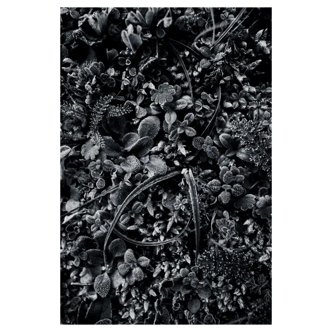 Cette photographie en noir et blanc capture la richesse visuelle d’un tapis végétal givré. Les feuilles miniatures, recouvertes de cristaux de glace, forment une mosaïque naturelle d’une grande finesse. La lumière diffuse révèle les nuances argentées du givre, transformant la matière en un motif graphique hypnotique.