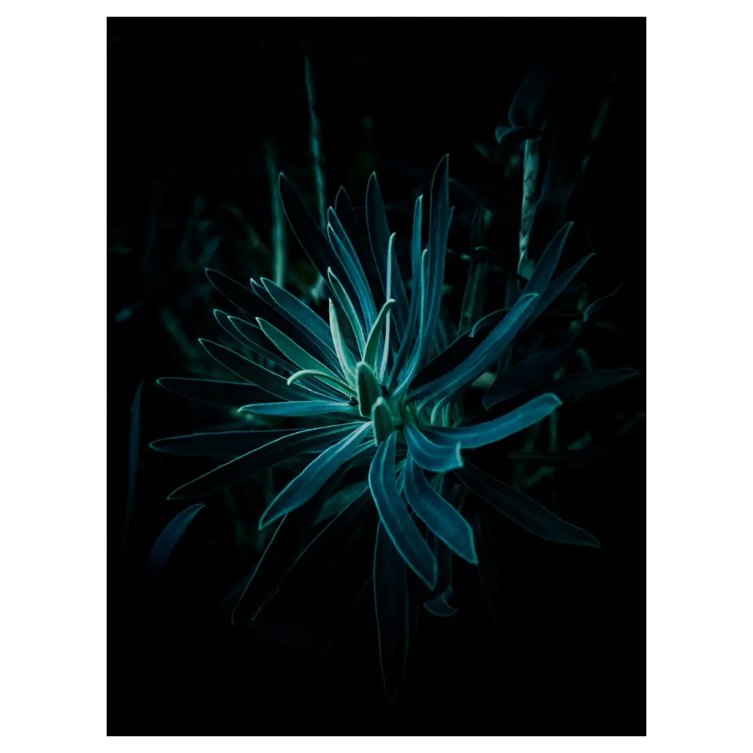 Photographie réalisée au Bois de Vincennes (Paris). Le cadrage met en exergue une rosette de feuilles longilignes aux reflets bleu-vert, éclairée comme en clair-obscur. Le rendu est minimaliste et sculptural, idéal pour des intérieurs contemporains ou esprit galerie.