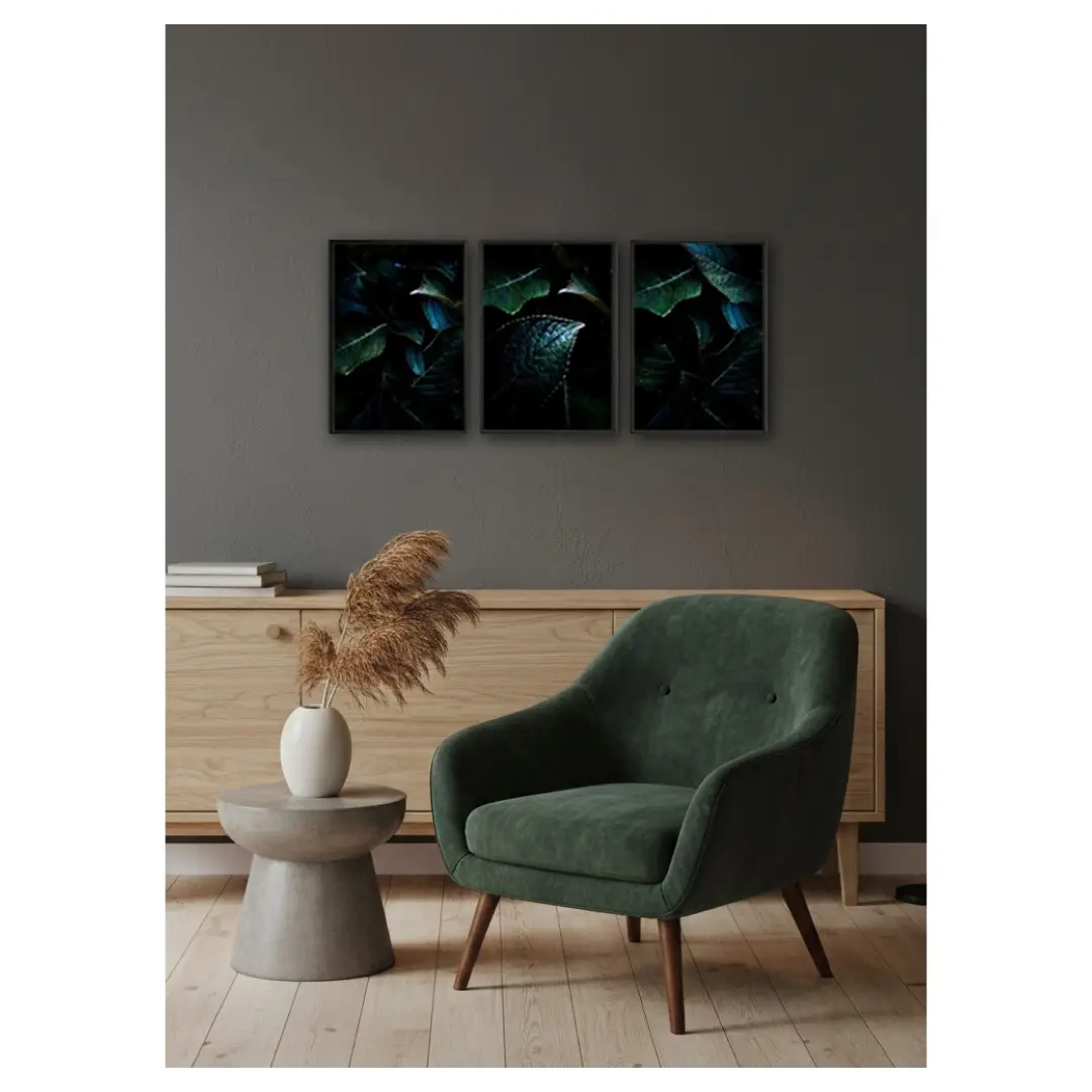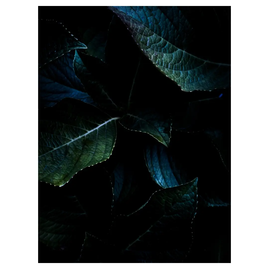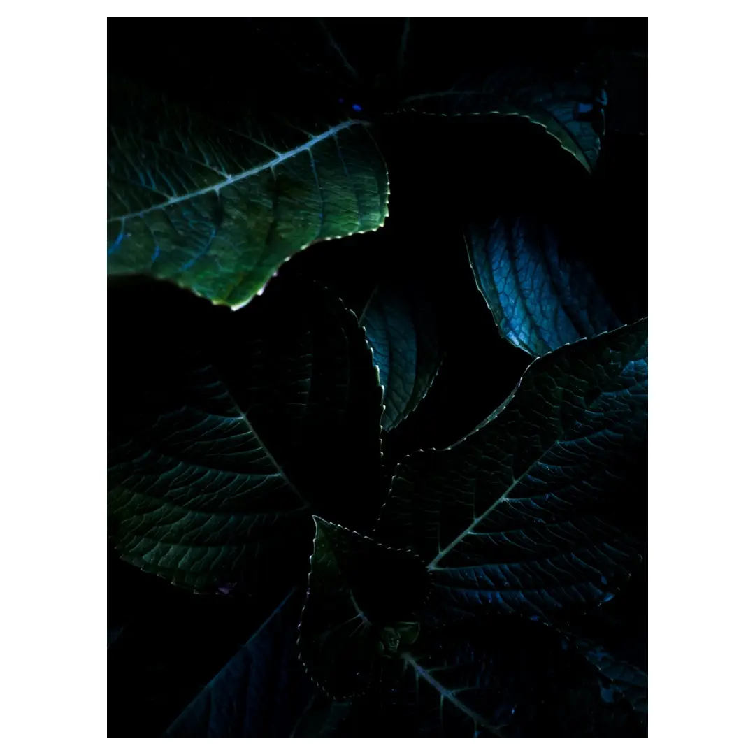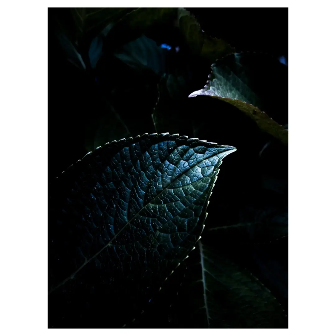 Trois vues complémentaires d’un feuillage de rhododendron en clair-obscur. La lumière révèle les nervures et un liseré lumineux, palette verte profond/bleu-noir. Ensemble graphique, apaisant et élégant, réalisé à Bayonne.